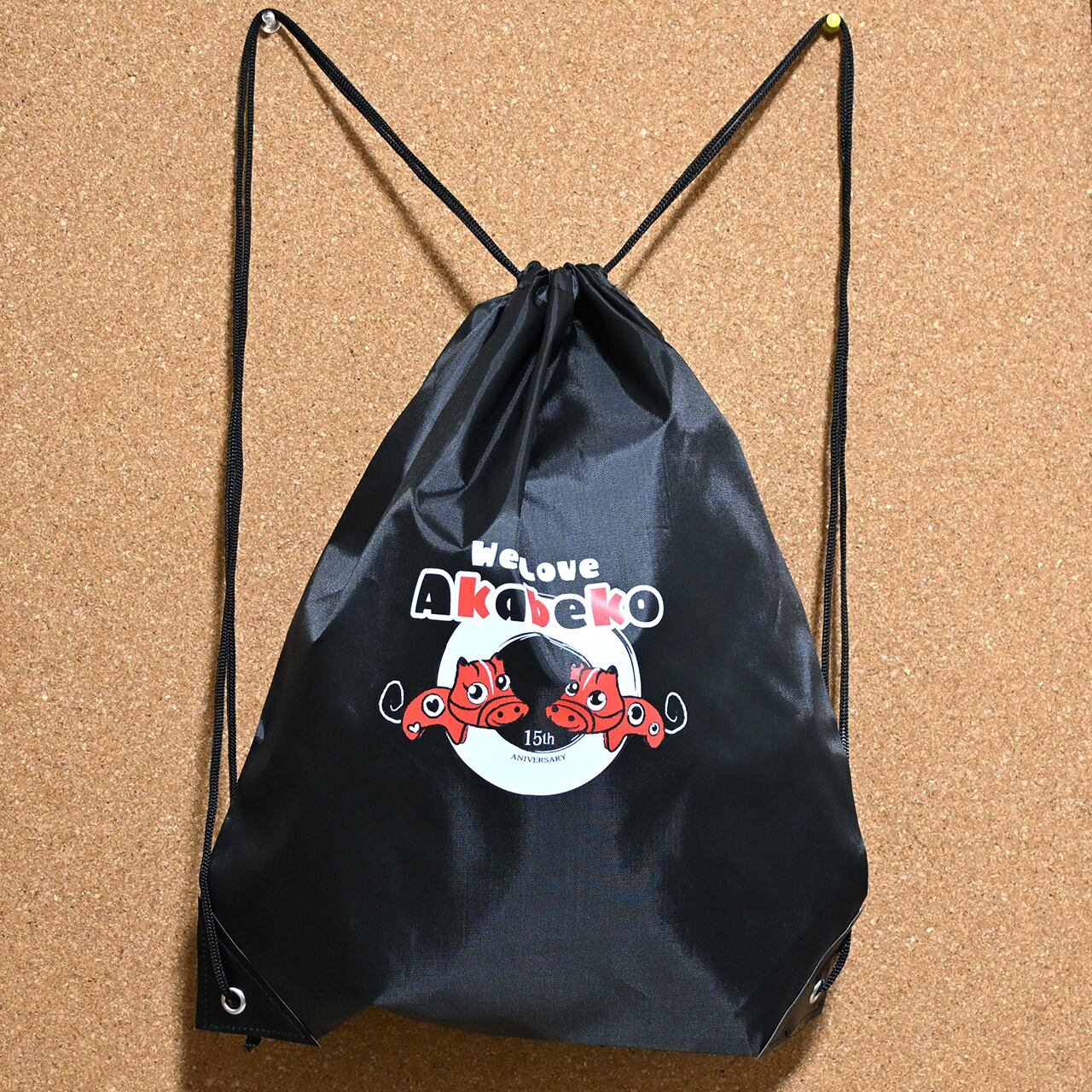 「We Love Akabeko」のロゴが可愛いナップサックは、